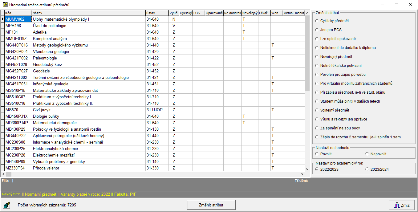 Po stisku tlačítka "Změnit atribut" se atribut změní u předmětů, které patří do roku, který je nastaven ve volbě "Nastavit pro akademický rok".