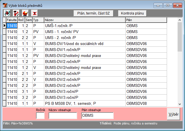 Tlačítko 2636.png otevře okno "Výběr bloků předmětů" s vybraným aktuálním plánem v položce "Plán obsahuje" viz. kapitola Bloky.