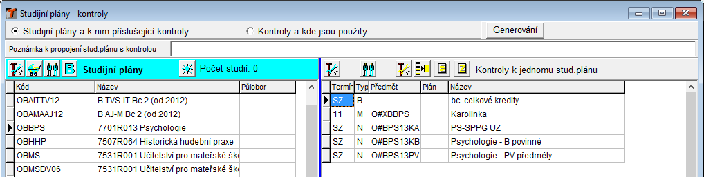 • Tlačítko Generování - slouží ke generování kreditních plánů pro dvouoborové studium na jedné fakultě. Tyto plány jsou určeny pro přidělení studentům - program Student, záložka Studium. Před generováním je potřeba vytvořit samostatné podplány pro příslušné "půlobory", které se v generování budou spojovat do plánů pro studenty. Při výběru plánů pro generování lze zvolit, zda se má do generování nového plánu přidat také obecný základ a kontrola plánem.