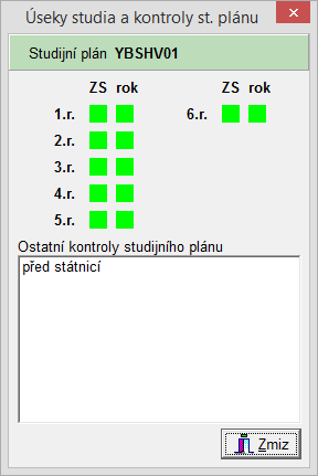 • V tomto okně jsou pro vybraný studijní plán zobrazeny všechny termíny kontrol v rámci studijních ročníků, zimního semestru a celého roku. Pokud existuje k danému časovému termínu alespoň jedna kontrola, je zde zobrazen zelený čtvereček. V dolní části okna se nachází seznam dalších kontrol plus kontroly prováděné vždy.
