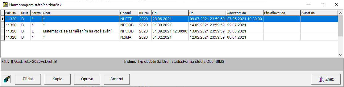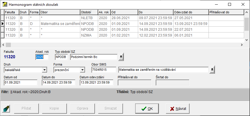 - Slouží pro nastavení období státních zkoušek, která lze specifikovat dle druhu, formy a oboru studia.