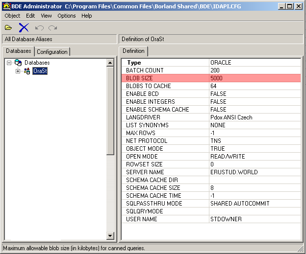Pro práci s většími datovými položkami typu BLOB (typicky fotografie, dokumenty, ukládané filtry-třídění-záložky atp.) doporučujeme zvýšit hodnotu BLOB SIZE alespoň na 5000 (odpovídá zhruba 5MB), aby nedocházelo k ořezávání.