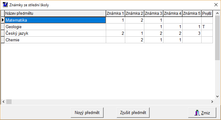 se otevře okno Známky ze střední školy, kde je možno uložit známky z jednotlivých předmětů a školních let.