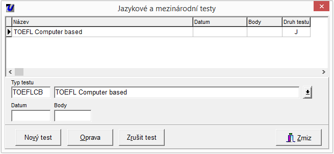 umístěné vedle pole pro stát SŠ se otevře okno pro evidenci: Jazykové a mezinárodní testy.