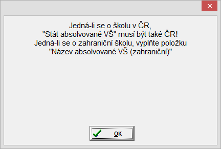 - Při ukončení editace přihlášky (tlačítkem "OK") probíhá kontrola na konsistenci vyplněných údajů. V případě, že je vybraný Stát absolvované VŠ = 203 (Česká republika), musí být údaj "Absolvovaná fakulta - VŠ" doplněn výběrem z číselníku. V případě, že vyplněný stát je jiný, než Česká republika, doplňuje se textem "Název absolvované VŠ (zahraniční)".