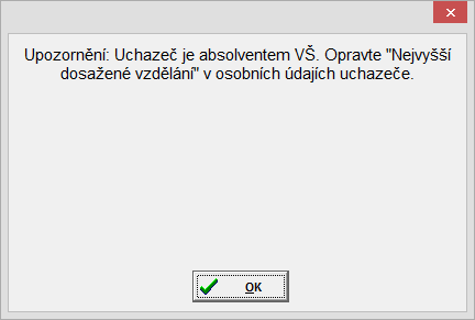 V případě, že je "Rok ukončení" absolvované VŠ menší než rok přijímacího řízení a v osobních údajích uchazeče je vyplněné "Nejvyšší dosažené vzdělání" menší než "bakalářské", program upozorní na nutnost opravy "Nejvyššího dosaženého vzdělání". Kontrola probíhá při ukončení editace přihlášky tlačítkem "OK".
