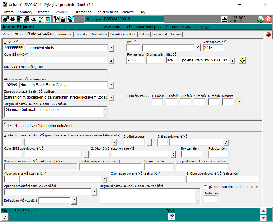 Na této stránce jsou evidovány údaje o předchozím vzdělání.
