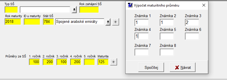 - Maturita - v editačním modu se dvojklikem do políčka "Maturita" otevře pomocné okénko pro výpočet maturitního průměru, po zadání známek a stisknutí tlačítka "Spočítej" vypočte maturitní průměr ve formátu * 100 a doplní se do políčka maturita.