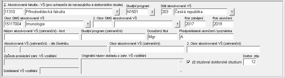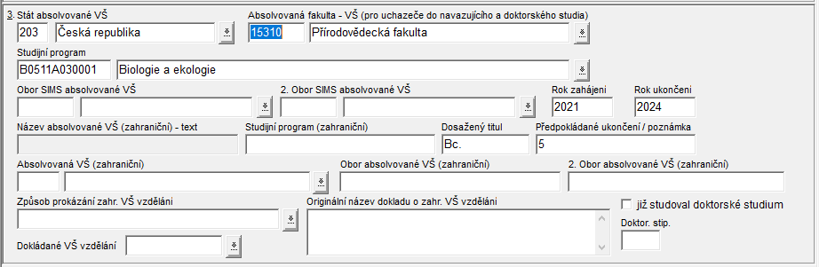 Studijní program výběrem z číselníku Studijní programy, "Obor SIMS" případně "2. Obor SIMS" absolvované VŠ z číselníku "Obory SIMS".