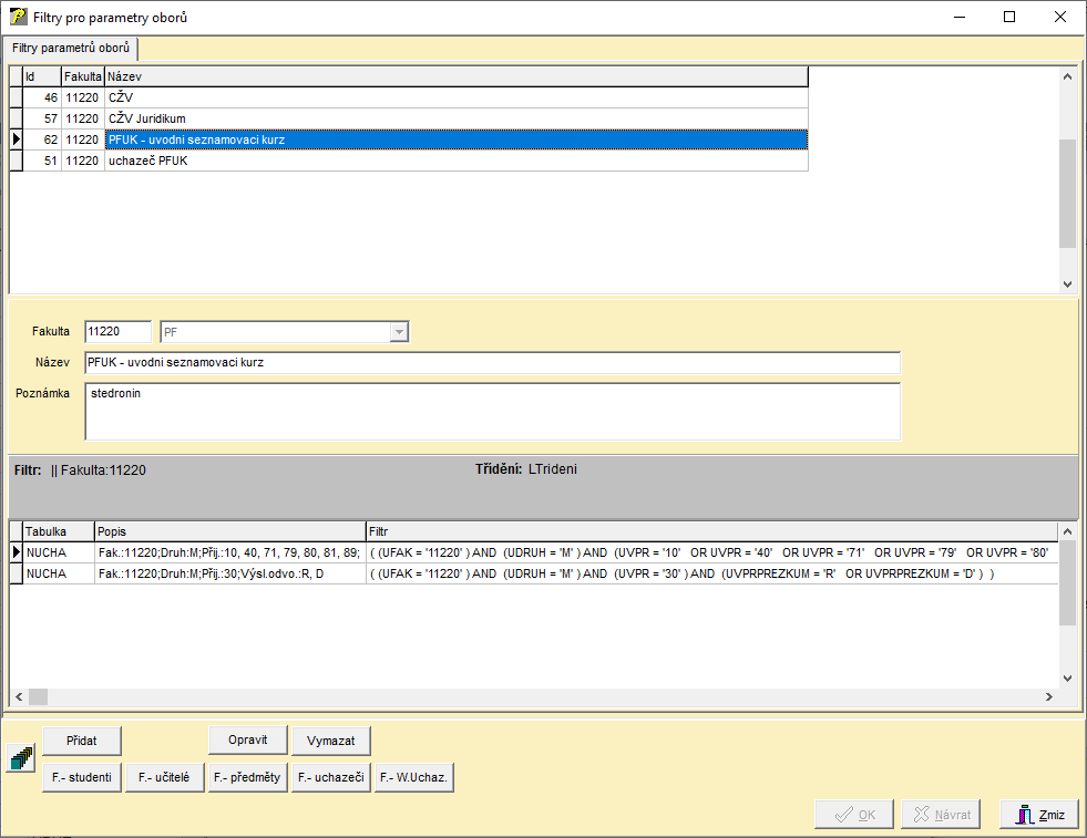 - F.-studenti - otevře detailní okno pro definici podmínek filtru nad tabulkou STUDIUM