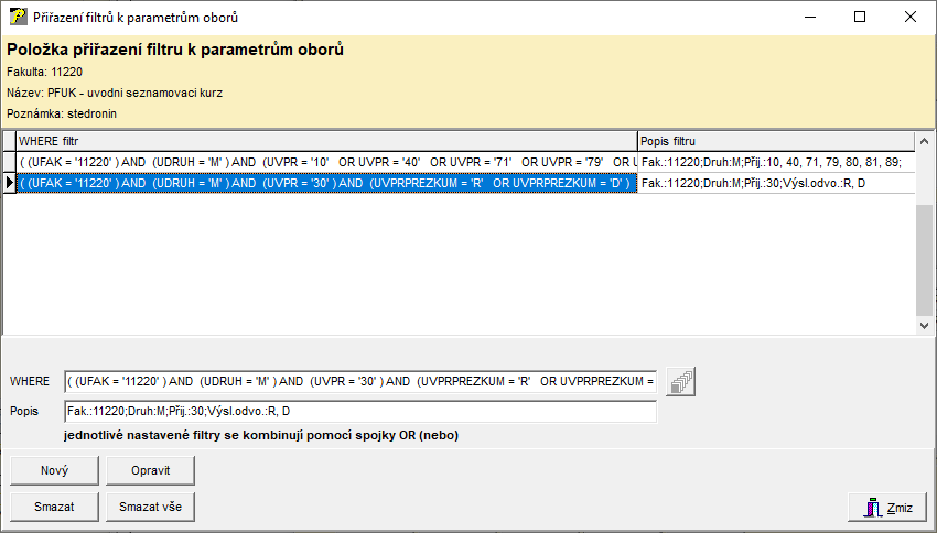 - Vymazat - smazat vybraný záznam. Poznámka: záznam lze smazat pouze v případě, že filtr není použit v parametrech oborů, v opačném případě program filtr smazat nepovolí.
