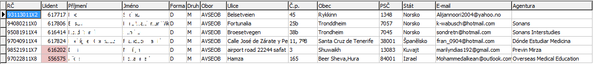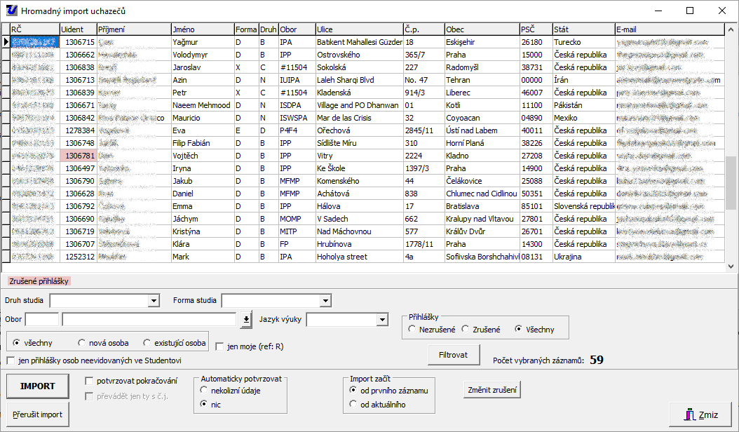 - filtrování osob na základě předchozí evidence: nová osoba - osoba, která prozatím není v evidenci uchazečů (studentů), existující osoba, všechny