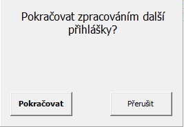 - potvrzovat pro pokračování - po zaevidování každé přihlášky musí uživatel potvrdit / zrušit převod další přihlášky. Pokud převod přihlášek přeruší, zobrazí se informace o počtu doposud zpracovávaných a zaevidovaných přihlášek.