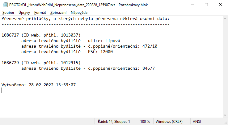 Po ukončení importu se zobrazí protokol se seznamem převedených přihlášek osob studujících/zaměstnanců školy, u kterých nebyla z web. přihlášky přenesena některá osobní data, která nesouhlasí s již evidovanými daty v IS.