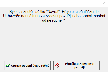 - pří této volbě je možno po stisknutí tlačítka "Návrat" v "Osobních údajích" uchazeče přerušit načítání přihlášky. Zobrazí se následující hláška a je možno vybrat volbu "Přihlášku zaevidovat později".