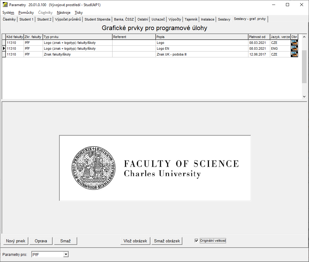 - Je-li zaškrtnut, pro tisk znaku VŠ/fakulty v dokumentech se místo grafického prvku "Znak fakulty/školy" použije graf. prvek "Logo fakulty/školy"