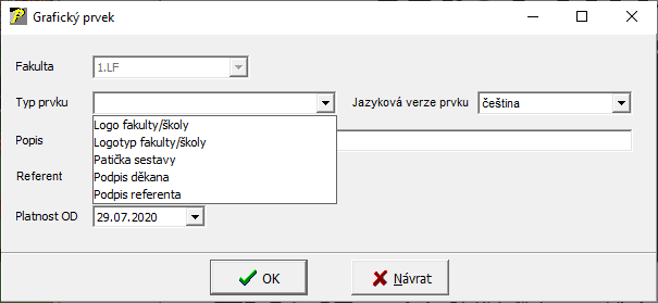- Referent - výběr z číselníku Referent (aktivní pouze při výběru typu prvku "Podpis referenta").