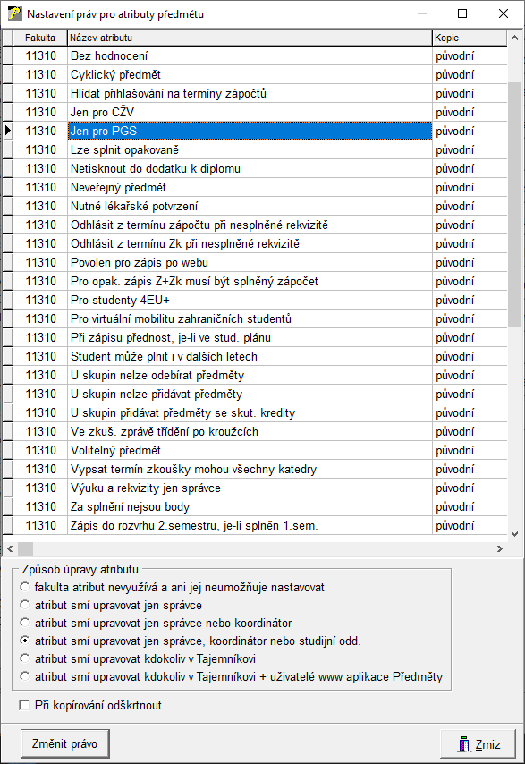 Parametry » Atributy předmětů » Nastavení práv pro atributy předmětů