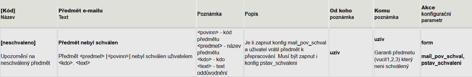Je-li zapnut konfigurační parametr mail_pov_schval a uživatel vrátil předmět k přepracování, odešle se garantovi předmětu informační e-mail dle šablony neschvaleno.