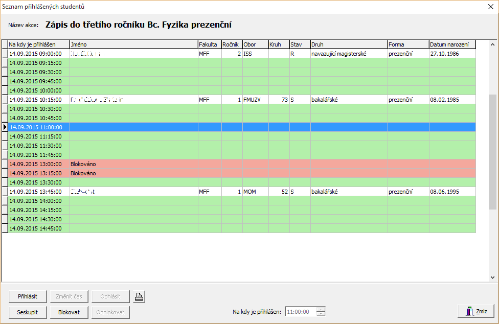 Kliknutím na tlačítko Blokovat referentka zablokuje časový úsek, studenti se na něj nemohou přihlásit.