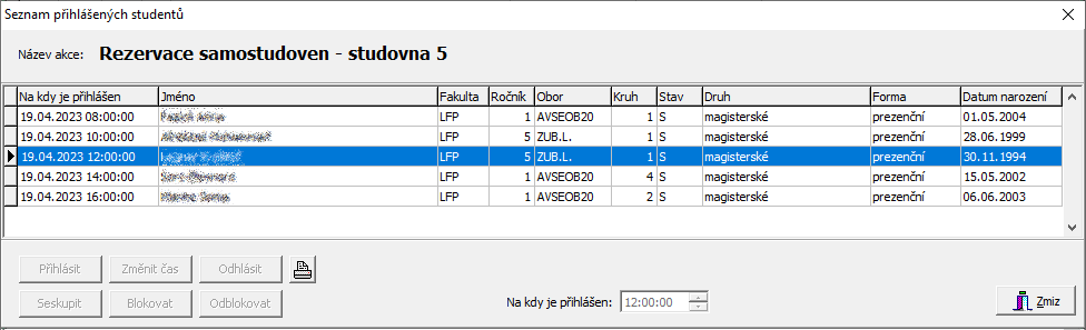 Parametry » Rezervační systém - Studenti » Seznam přihlášených