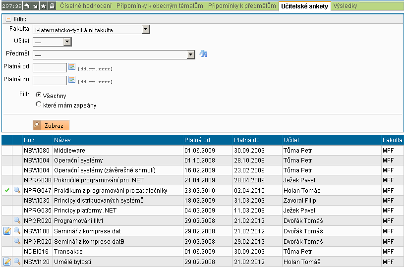 - Filtr - pouze pro studenty - výběr z předmětů všechny/které mám zapsány
