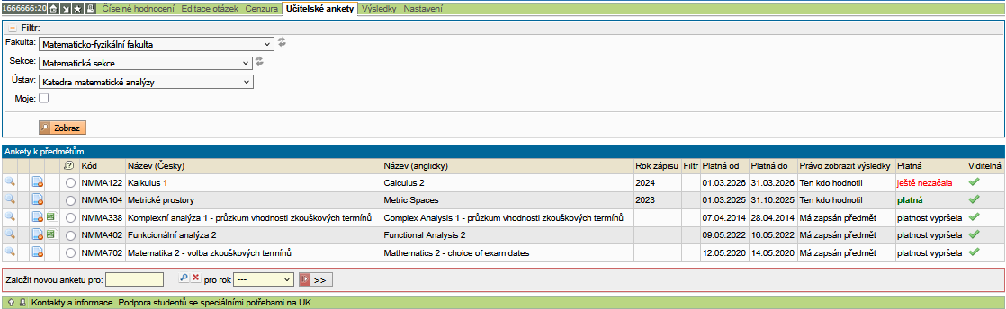 - Založit novou anketu pro: - po výběru předmětu z nabídky vyučovaných předmětů učitele a kliknutí na tlačítko