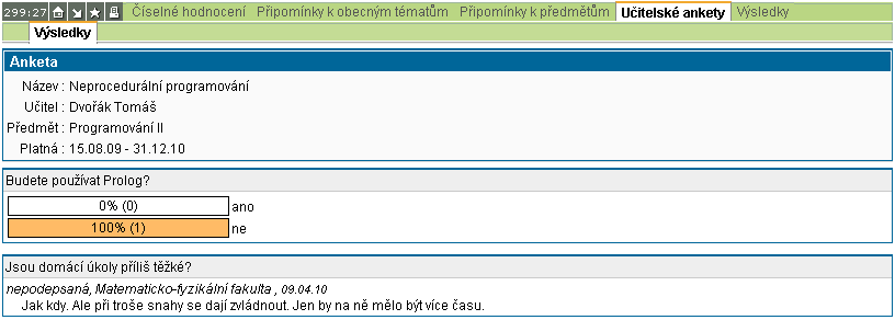Výsledky jsou zobrazeny buď graficky - pro případ ankety, kde jsou odpovědi vybírány ze seznamu, nebo popisem: