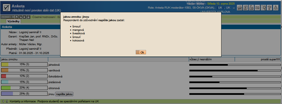 U anket, které mají doplňující odpovědi, je ve výsledcích přidáno tlačítko pro zobrazení popup okna se zněním doplňujících odpovědí.