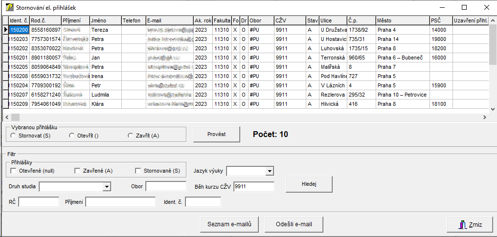 - Pokud uživatel dohledá přihlášku, kterou chce upravit, označí ji v seznamu a zvolí, jakou akci chce vykonat (stornovat, otevřít, zavřít) a stiskne tlačítko Provést.