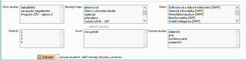 Pomocí nastavení filtru vybereme předmět, případně paralelku, jejichž studenty chceme zobrazit. Po výběru předmětu se zobrazí druhá půlka filtru, kterým je možno omezit skupinu vypisovaných studentů (dle druhu studia, studijního stavu, oboru, ročníku, kruhu či formy studia).