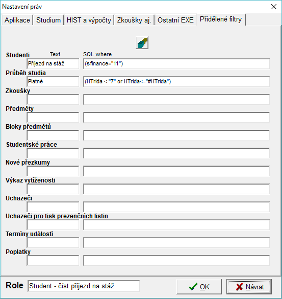 Správce » Program Správce » Role » Přidat roli / opravit práva » Přidělené filtry