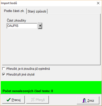 Přerušit při jiné chybě - načítání bodů se přeruší při jiné chybě, než je vyplněnost zkoušky.