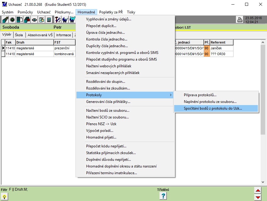Uchazeč » Uchazeč » Hromadné operace s uchazeči » Protokoly » Sčítání bodů z protokolu do Uzk