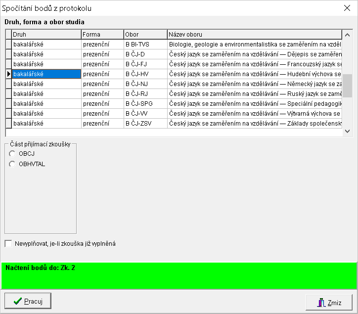 - V okně "Spočítání bodů z protokolu" jsou zobrazeny všechny obory z Parametrů oborů dle formy, druhu a oboru, které: