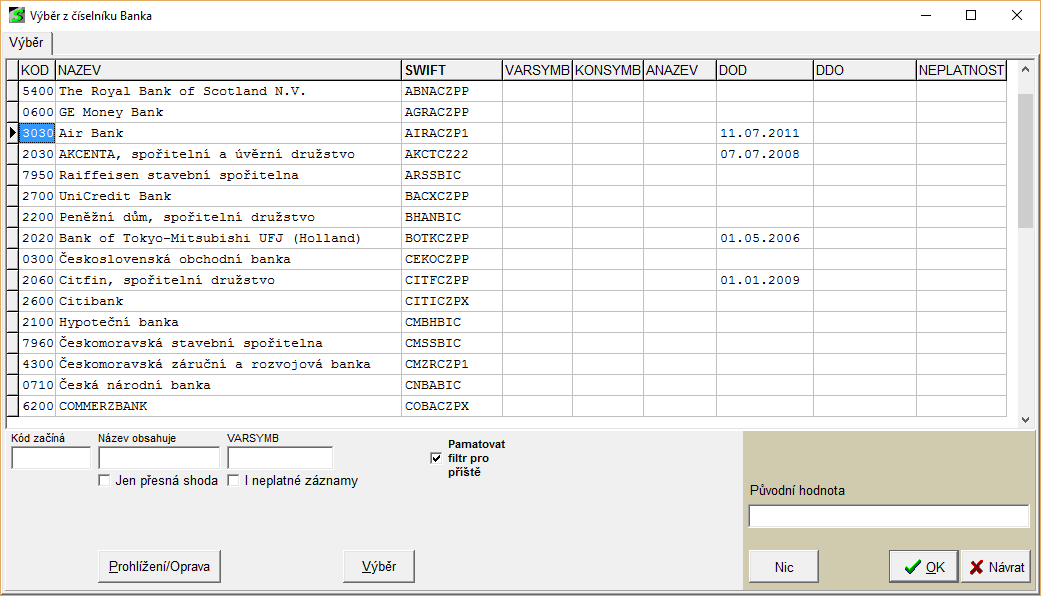 (viz např. další obrázek - vyvolání číselníku bank). Vyplňujete banku, jste nastaveni ve sloupci Banka.