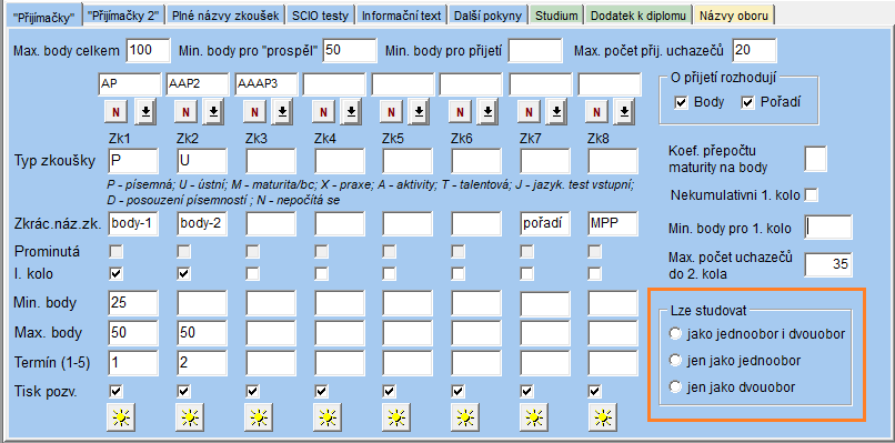 Parametry » Parametry oborů » Záložky v dolní části » Přijímačky