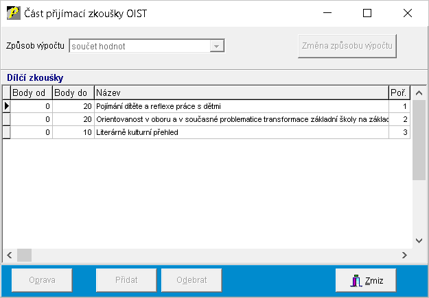 Dílčí zkoušky k jednotlivým částem zkoušky se nastavují v číselníku Části přijímací zkoušky tlačítkem Dílčí zkoušky.