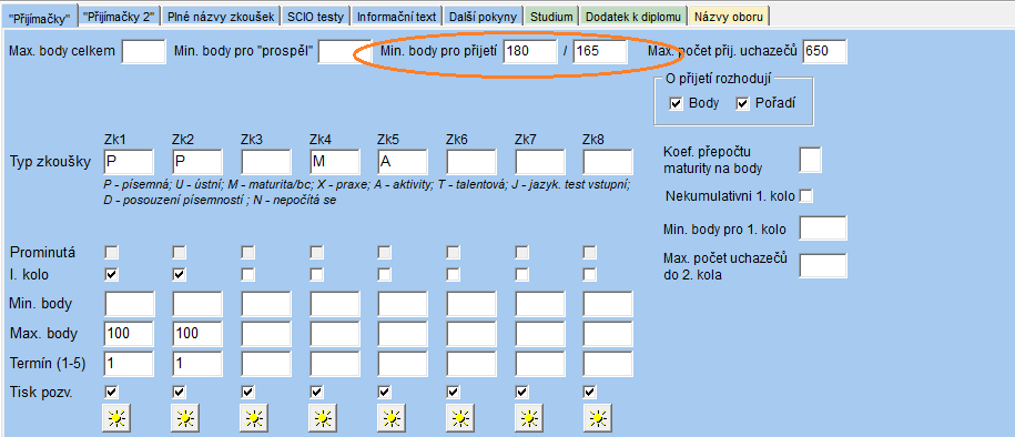 - Minimální body pro 1. kolo - počet bodů, které musí uchazeč získat v 1. kole, aby mohl postoupit do 2. kola.