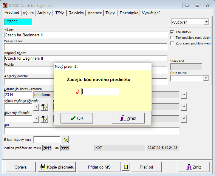 Nový předmět je možno vytvořit kliknutím na tlačítko Kopie předmětu. Otevře se okno pro zadání kódu nového předmětu.