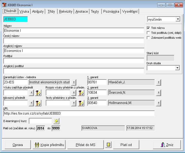 - Předmět se přidá s 1 interním bodem nebo se skutečnými kredity podle nastavení atributu "přidávat předměty se skutečnými kredity" u příslušné malé skupiny.