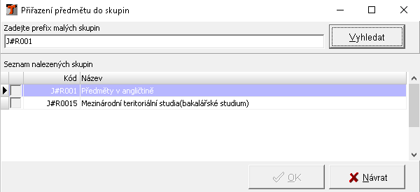 Podle zadaných počátečních znaků se vyhledají odpovídající skupiny a uživatel vlevo zaštkrtne, do kterých skupin předmět přidat.