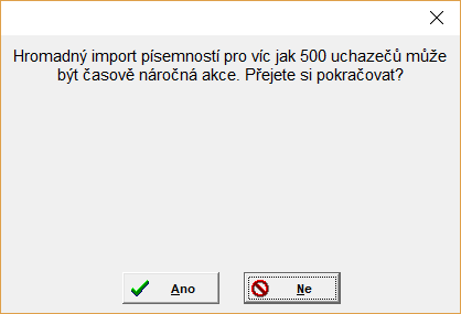 - při importu písemnosti většímu počtu uchazečů než 500 se zobrazí potvrzovací hláška, že chcete akci provést