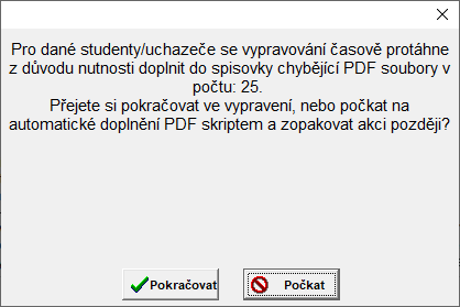 V případě, že chcete naimportované písemnosti vypravit ihned a zvolíte vypravení "Českou poštou" (typ vypravení P,R,V,L,C - viz kapitola Hromadné vypravení) a počet souborů je větší než 20, program upozorní na skutečnost, že se vypravení protáhne z důvodu, že se soubory musí nejprve předat do spisovky:
