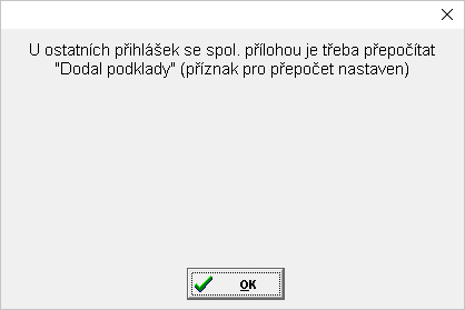 - 2. u ostatních přihlášek se nastaví nový příznak pro přepočet "Dodal podklady". Program na to upozorní informativní hláškou: