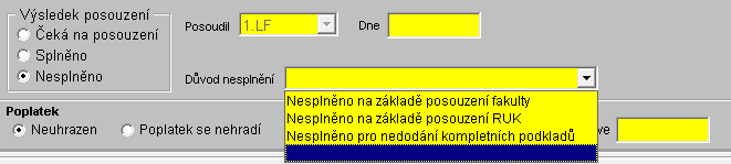 • "Důvod nesplnění": vybírá se z číselníku "Výsledek uznání nostrifikace".