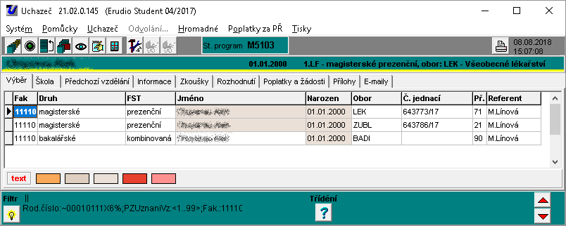 • Na záložce "Výběr" v hlavním okně Uchazeče jsou podbarveni uchazeči, kteří mají záznam na záložce "Uznání vzdělání". Podbarvují se ve sloupci "Narozen", stejnou barvou, která se používá ve sloupci "Jméno" pro stav "Přijat, vše v pořádku".