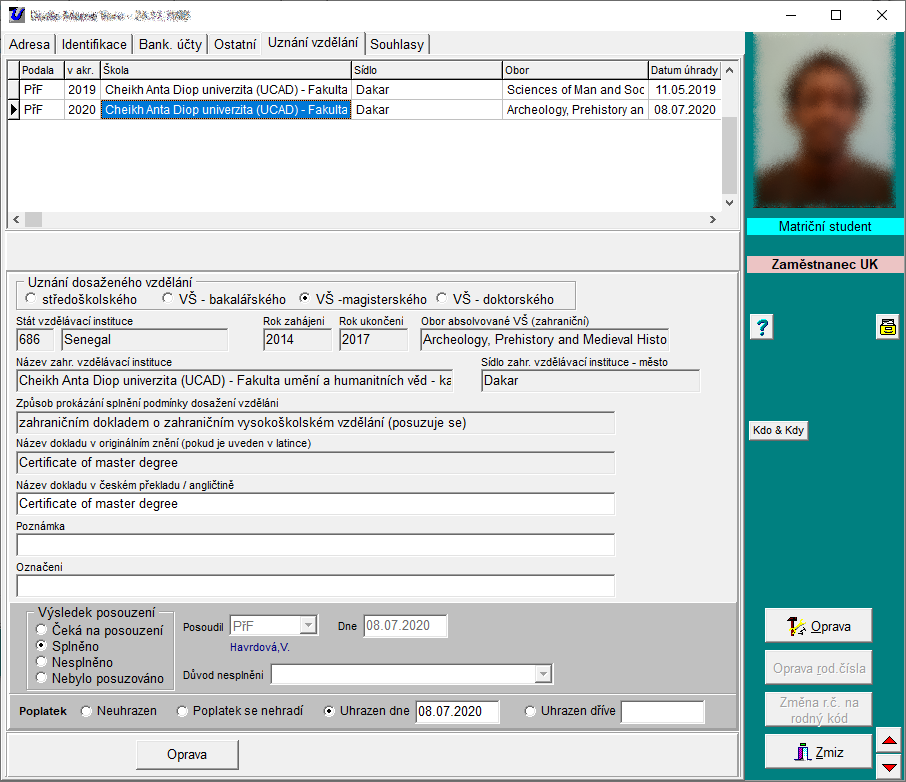 IS STUDIUM » Základní ovládání programu » Ovládání programů systému STUDIUM » Evidenční údaje osoby » Uznání vzdělání