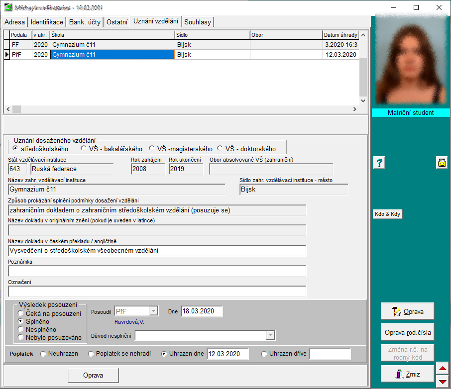 • Údaje o uznání vzdělání lze editovat i v aplikaci Student. Tato možnost je však časově omezena koncem kalendářního roku, v němž byla přihláška podána (rok se zobrazuje ve sloupci "v akr.")