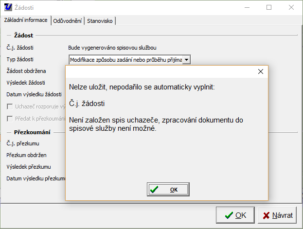 Pokud uchazeč nemá založený spis ve spisové službě, tak program neumožní založit novou žádost.